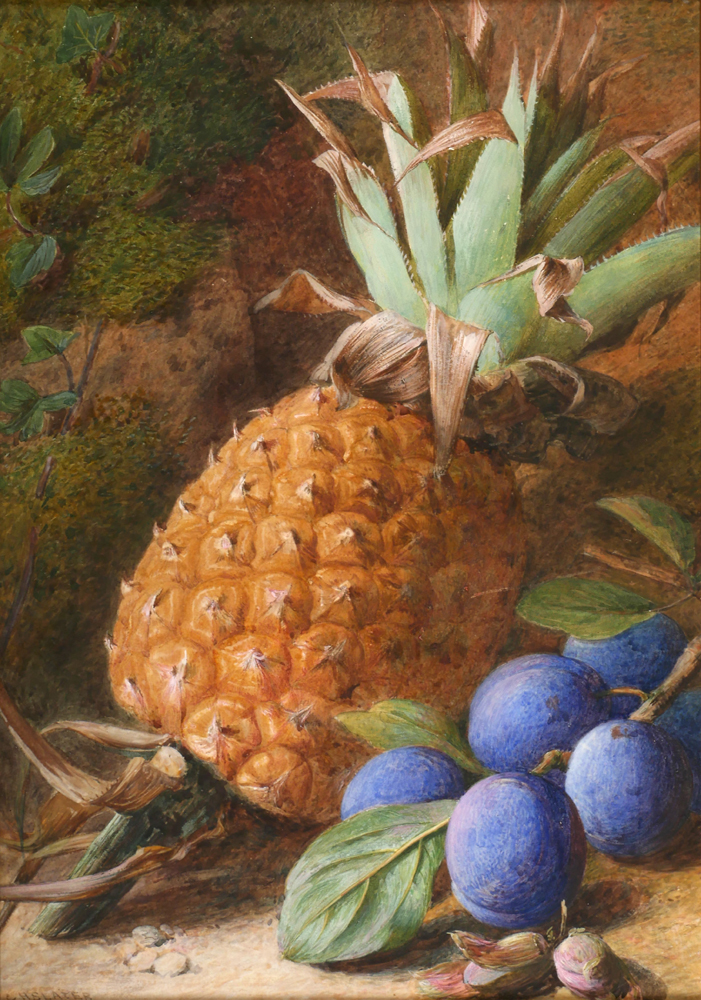 STILL LIFE OF A PINEAPPLE AND PLUMS ON A MOSSY BANK