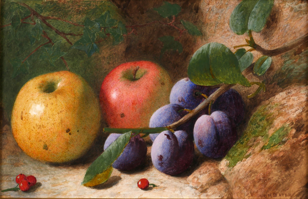 STILL LIFE OF APPLES, CHERRIES AND PLUMS ON A MOSSYBANK