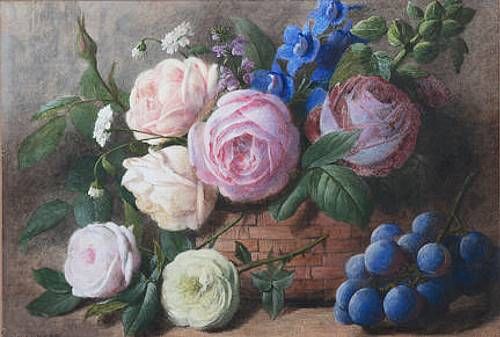 still life study of roses, other blooms and grapes