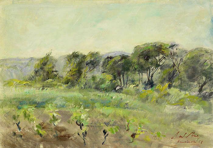 | Ramatuelle bei St-Tropez. Landschaft mit kleinem Wäldchen, im Vordergrund Weinberg. 1968. | |