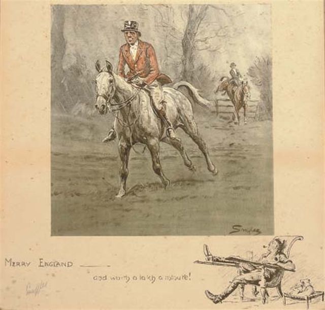 | The gent in ratcatcher; The huntsman; and Merry England all signed 'Snaffles', with snaffle blindstamp | |