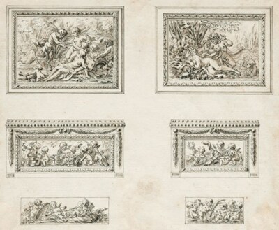 | Designs for a snuffbox, with mythological subject: Pan and Syrinx and Jupiter and Antiope and vraious scenes with putti | |