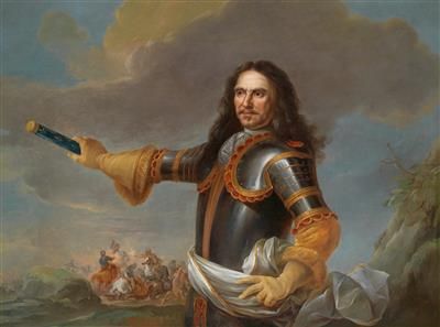 | Portrait of Henri de La Tour d’Auvergne, Vicomte de Turenne, Marshall of France (1611–1675) with a mounted skirmish in the backg | |