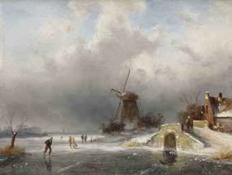 Figures skating on ice near a windmill