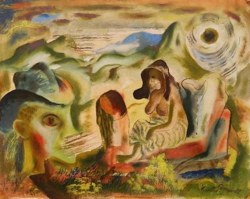 | Seated Bare Breasted Figure and Large Head with Hat in Abstract Landscape | |
