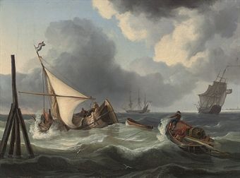 Fishermen wrestling with the swell at high tide, off the mouth of the Scheldt