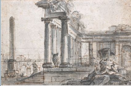 | Pen and brown ink, gray wash, over black pencil strokes | |