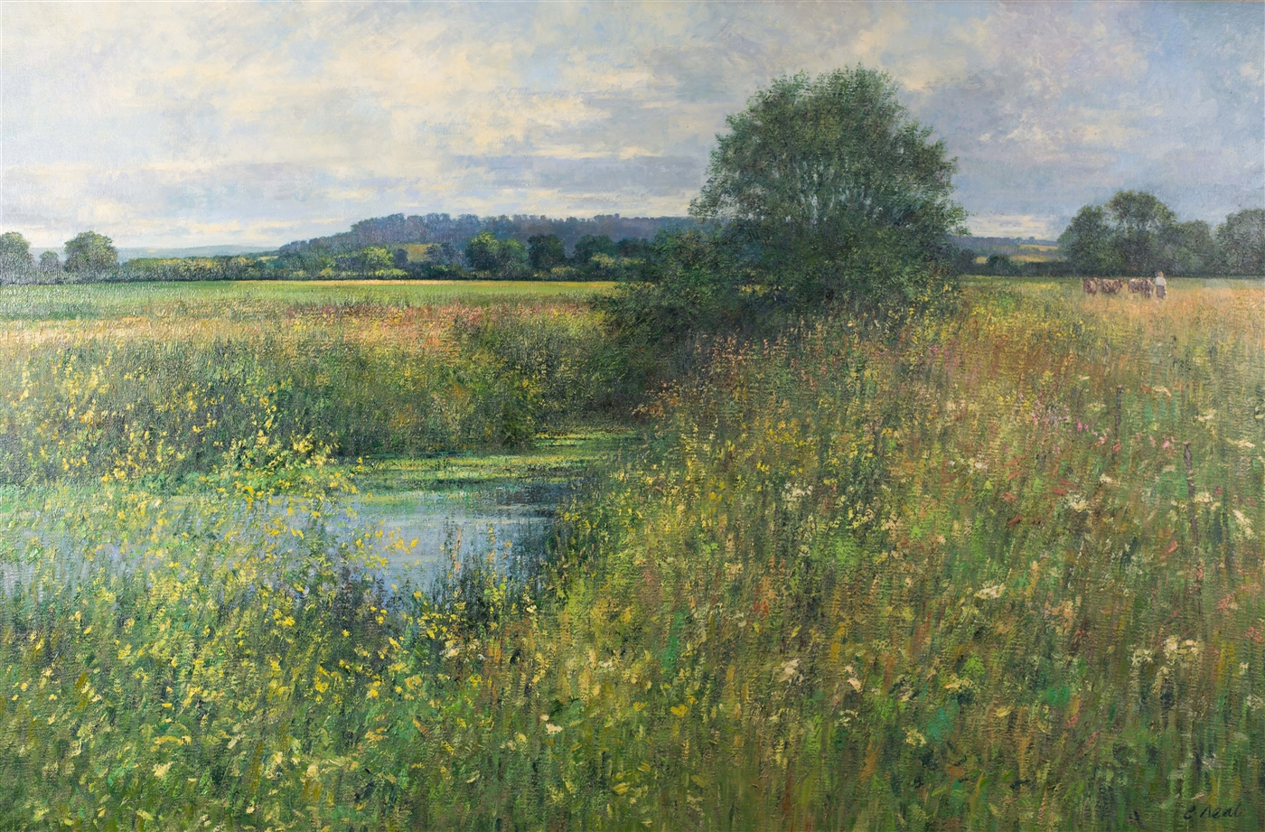 | Meadow Scene/with pond, willow trees and cattle in the distance | |