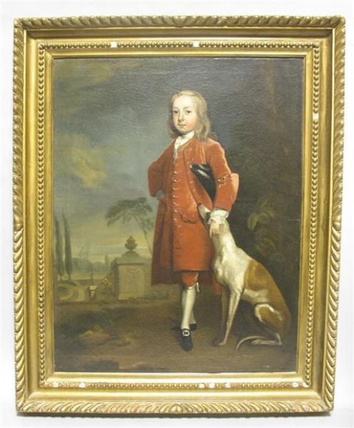 PORTRAIT OF A BOY IN A RED COAT WITH HIS DOG