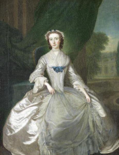 Portrait of a lady, full-length, in a white silk dress, seated on a terrace