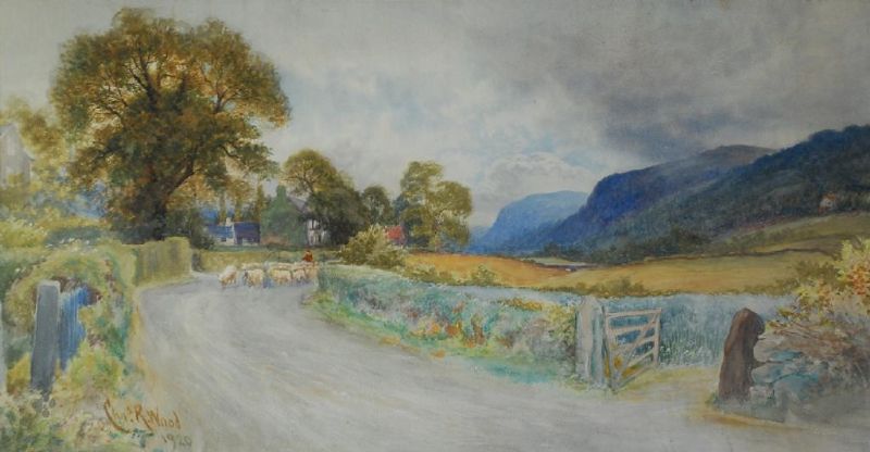 | Rural scene with shepherd driving sheep down a lane past buildings, mountains in the background | |
