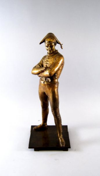 A bronze figure of a Harlequin standing on a simulated wood stage