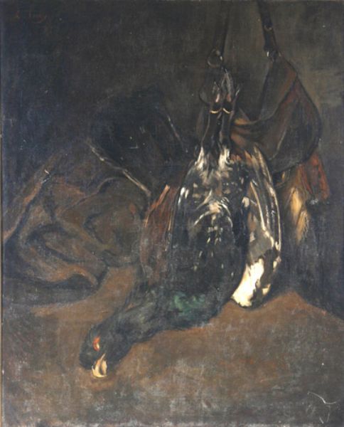 Jagdstilleben, erlegter Auerhahn und Jagdtasche