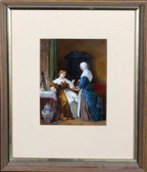The Pearl Necklace - an interior scene with a young woman attended by her maid