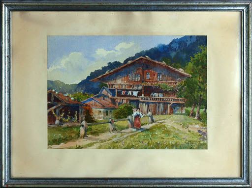 | Blick auf einen Walliser Bauernhof mit Nebengebäuden und Figurenstaffage unter sommerlichem Himmel | |