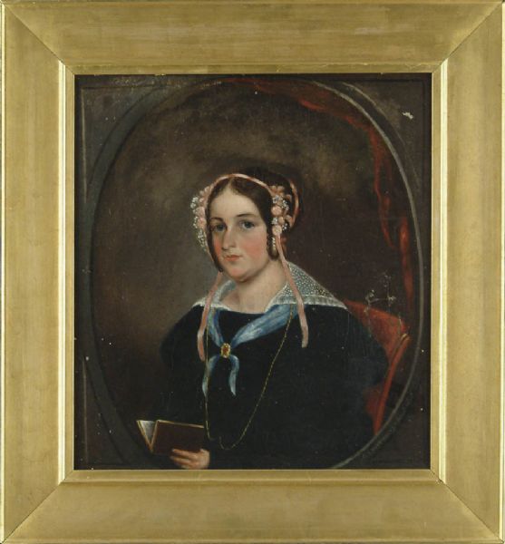 | Oil on canvas portrait purported to be Rebecca S. Jinnett. She is seated in a red chair wearing a black dress with lace collar and blue scarf, 2 items | |