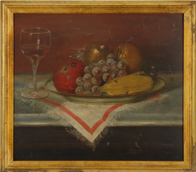 Still life with fruit and a wineglass on a marble tabletop