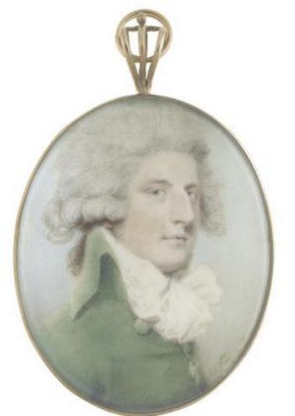 A Gentleman, wearing bright green coat and voluminous frilled white cravat, his wig powdered.
