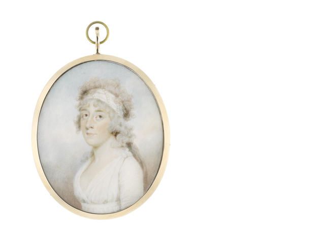 | A Lady, wearing white dress and matching bandeau finished with pearls in her curled and powdered hair. | |