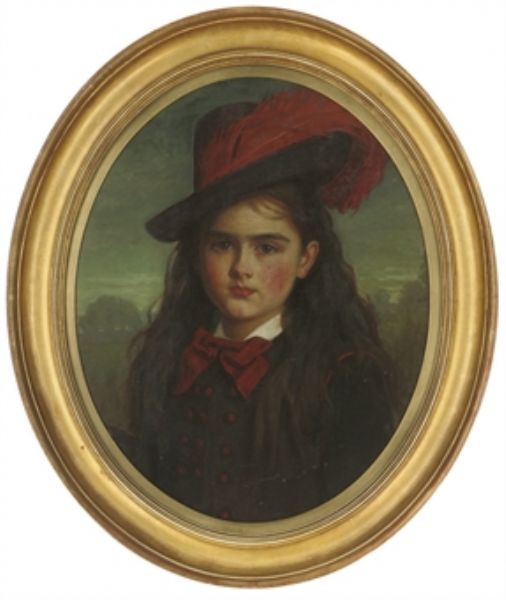 | Portrait of a young girl, bust-length, in a moave coat and hat with a burgundy feather, a landscape beyond | |