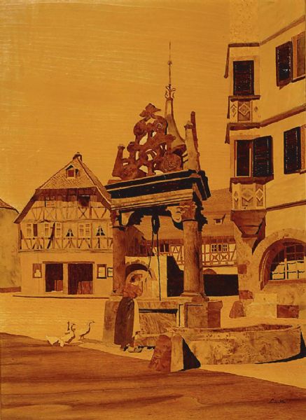 Intarsienbild, junge Magd mit Gänsen am Brunnen von Boersch, reiche Einlegearbeiten mit versch