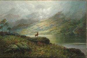 Stag and hinds beside a loch
