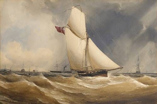 A large racing cutter in the Channel, the hills above Portsmouth in the distance