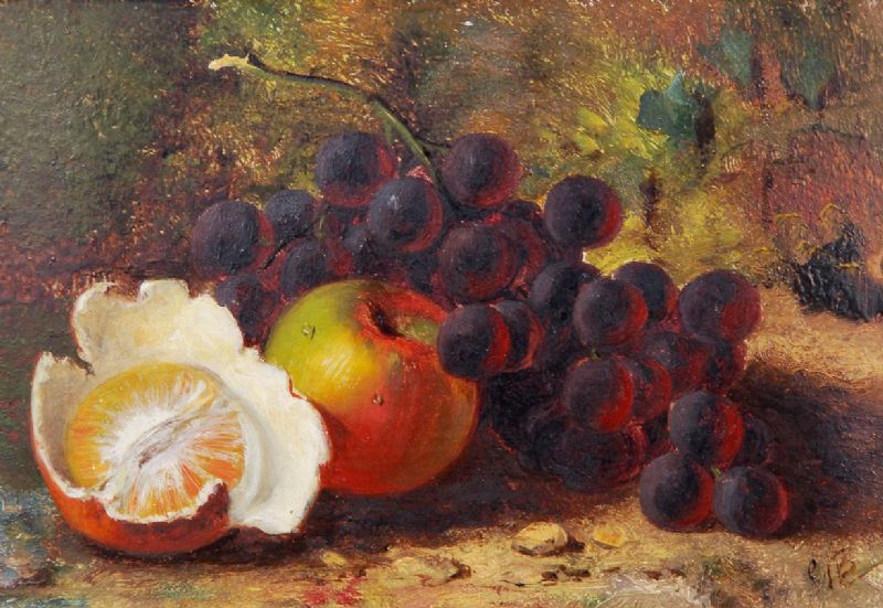 A still life of apples and grapes on a mossy bank; A still life of apples, grapes, and a tangerine