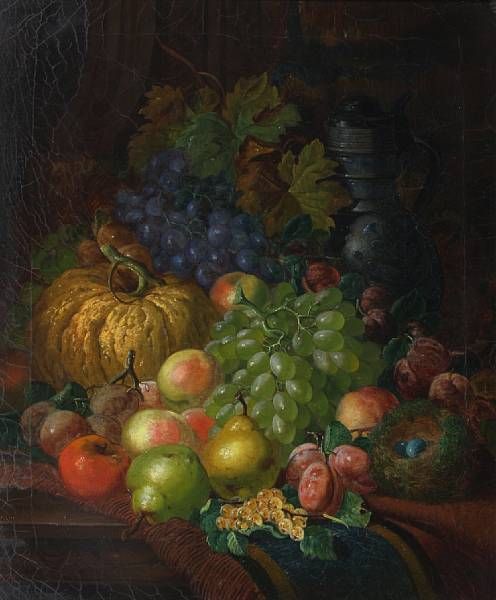 Pumpkin, black and green grapes, plums, peaches and other fruit on a table