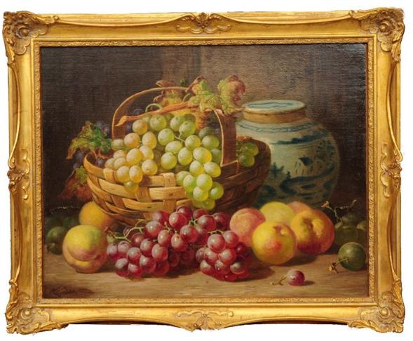 | Still life - A basket with an abundance of grapes and peaches and blue and white ginger jar behind | |