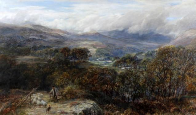 Extensive upland landscape with shepherd, flock and sheepdog