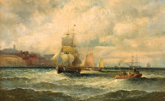 | Shipping off a coastal town, various sailing ships, a steamship and a rowing boat | |