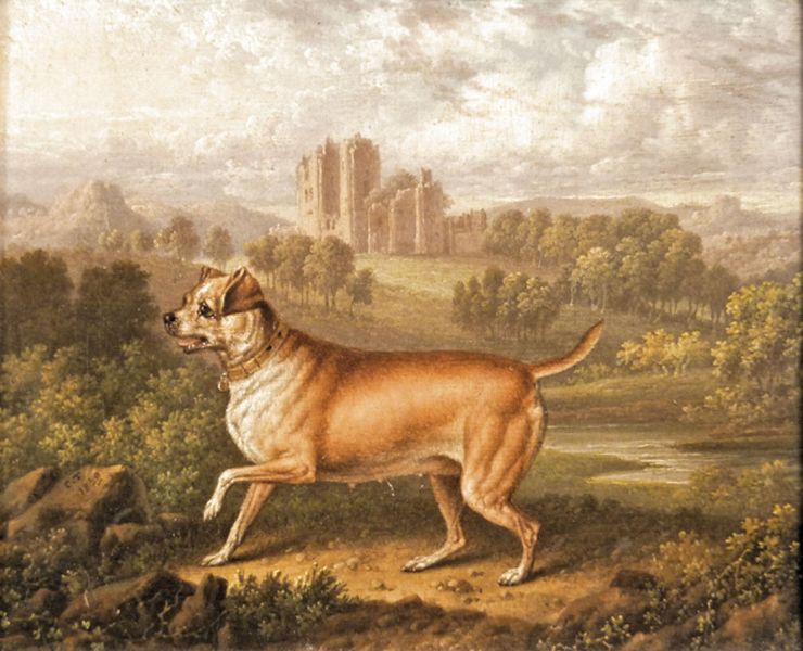 A MASTIFF IN A LANDSCAPE WITH DISTANT CASTLE RUINS
