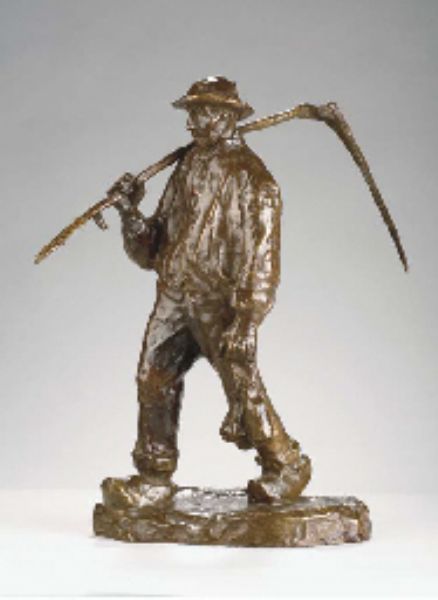 Man met zeis op weg naar de arbeid
