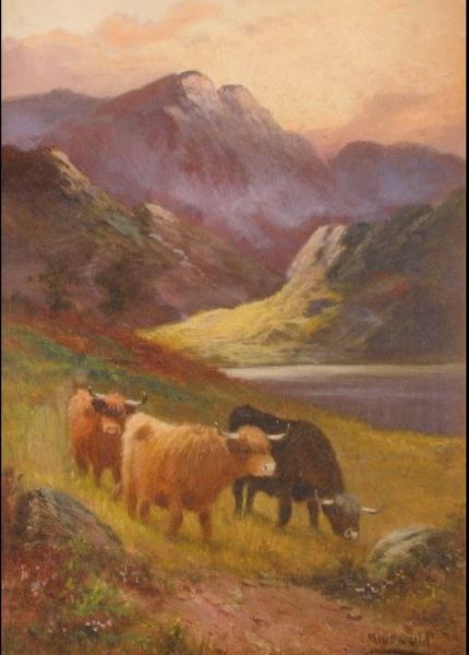 Highland cattle in a Loch landscape