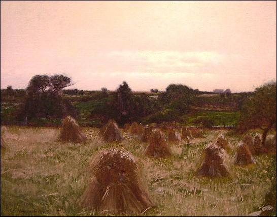 | tonalist landscape with shaded haystacks and trees, sky with pink blush | |