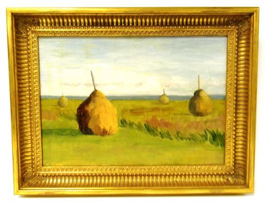 depicting summer meadow with four hay stacks