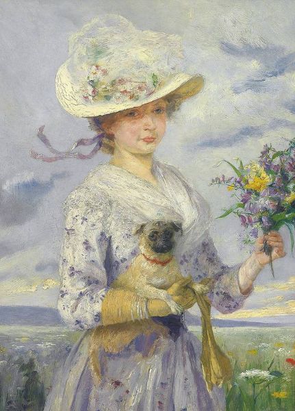 Selbstportrait der Künstlerin auf Frühlingswiese mit Hund