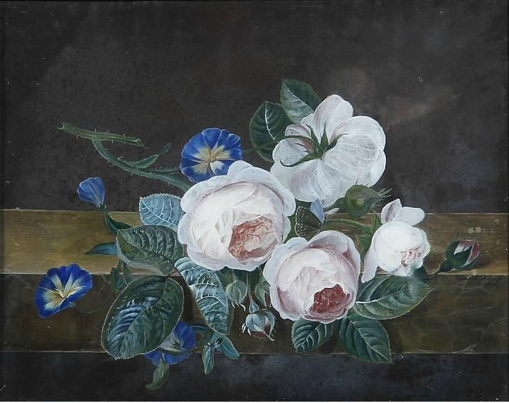 Still life with a bouquet roses and bindweed on a stone sill.