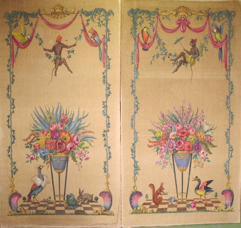| Paire de peintures décoratives, à décor d'athéniennes fleuries, d'animaux et d'oiseaux exotiques dans un entourage de guirlandes | |