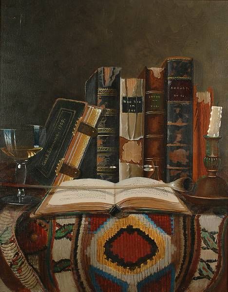 Still life of books, a glass of wine, candle and a clay pipe on a rug on a table,