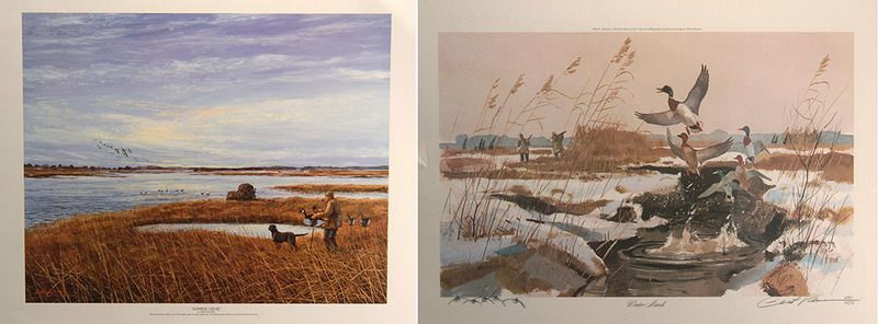 Depicts lifting mallards in a winter marsh with hunters in the background