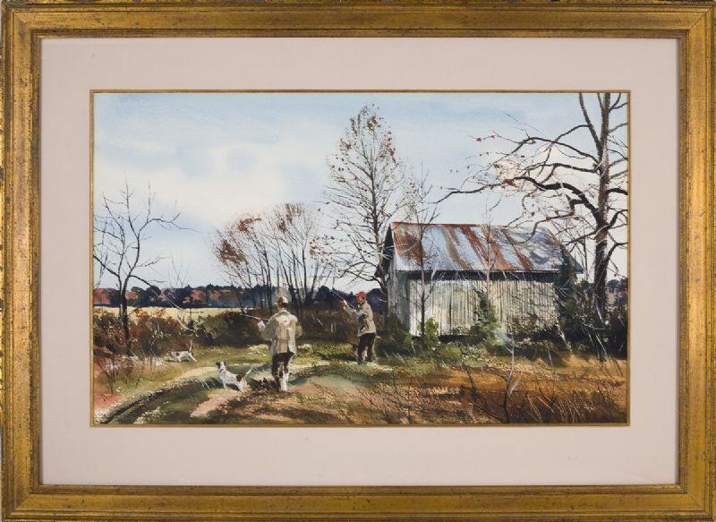 HUNTERS AND DOGS IN AN AUTUMN LANDSCAPE.