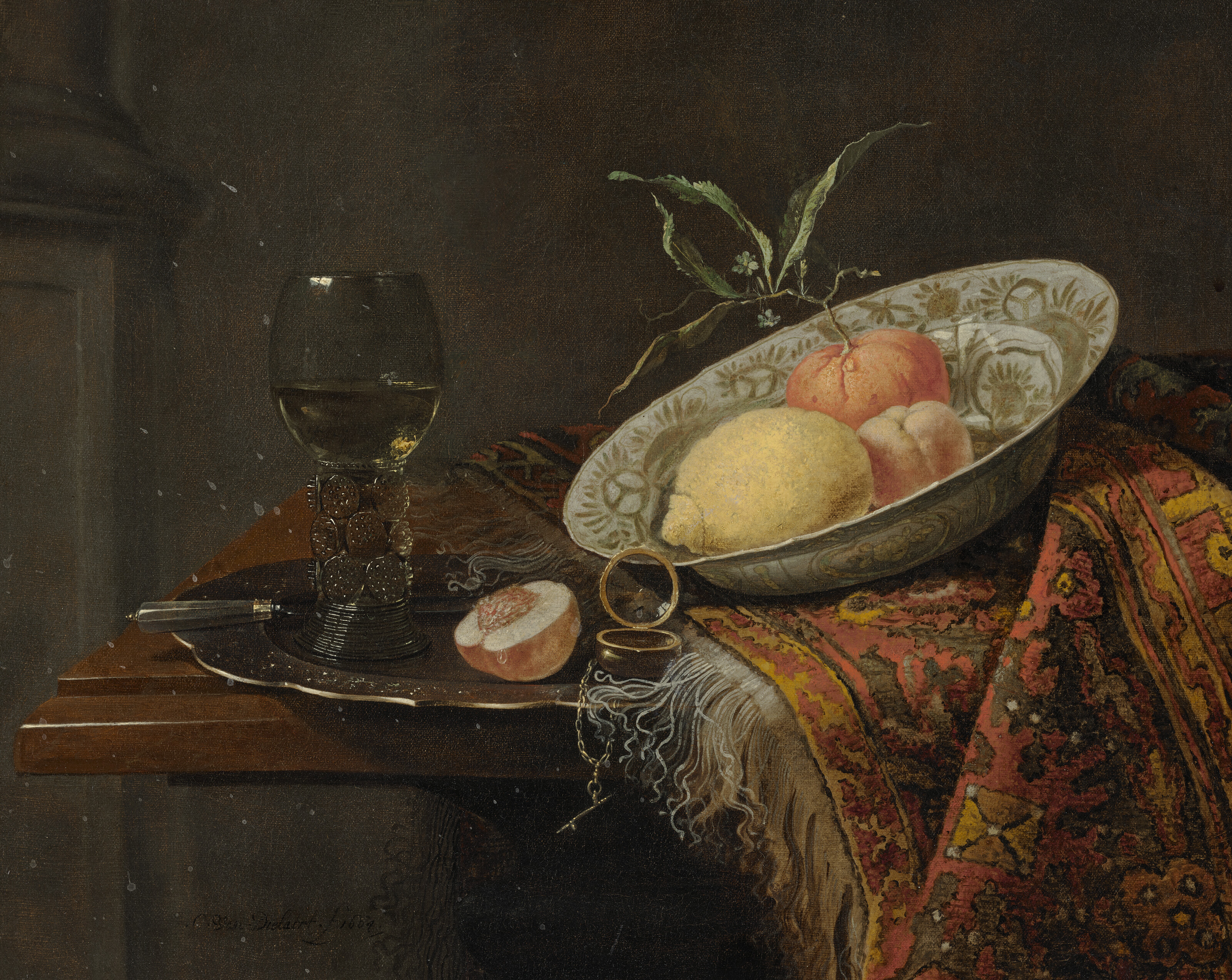 A lemon orange and nectarine in a porcelain bowl on a rug and a roemer on a pewter platter on a table