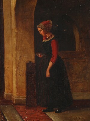 A church interior with a woman in traditional dress.