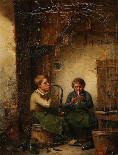 | Two boys smoking the pibe at the shoemaker | |