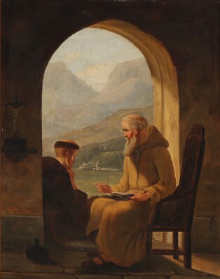 | Two monks talking in a loggia with a view of a mountain lake | |