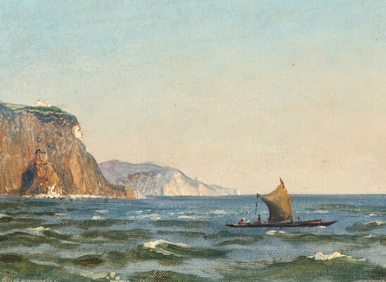 | Seascape with sail boat near the coast | |