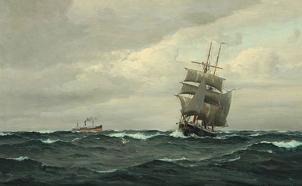 | Seascape with sailboats and steamer in the background. Signed Chr. Benjamin Olsen. | |