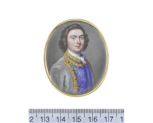 | A Gentleman, wearing pale grey coat with Royal blue placket edged with gold braid and buttoned back, his dark curled hair worn i | |